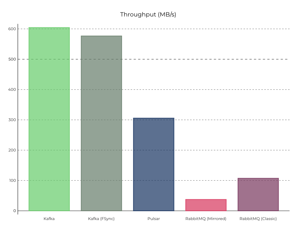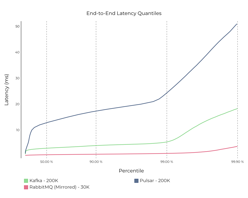 当且仅当消息尚未被消费时,RabbitMQ 会使用一个持久队列将消息持久化到磁盘。然而,与 Kafka 和 Pulsar 不同,RabbitMQ 不支持“回放”队列来再次读取较旧的消息。从持久性的角度来看,在我们的基准测试中,消费者与生产者保持同步,因此,我们没有注意到任何写入磁盘的操作。我们还在一个三代理集群中使用了镜像队列,使 RabbitMQ 提供与 Kafka 和 Pulsar 相同的可用性保证。