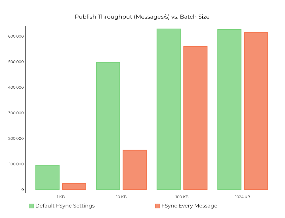 图 2:批次大小对 Kafka 吞吐量(每秒消息数)的影响,绿条表示 fsync=off(默认),橙条表示 fsync 每条消息