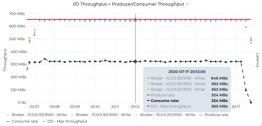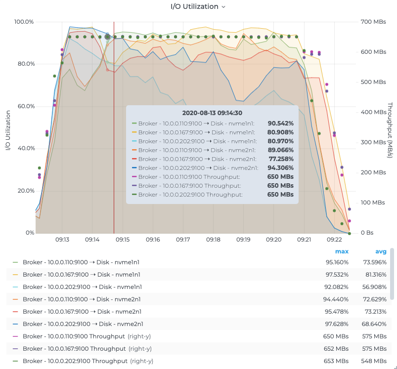 图 7:Prometheus 节点指标显示 Kafka 代理上的 I/O 利用率以及相应的生产者 / 消费者吞吐量。