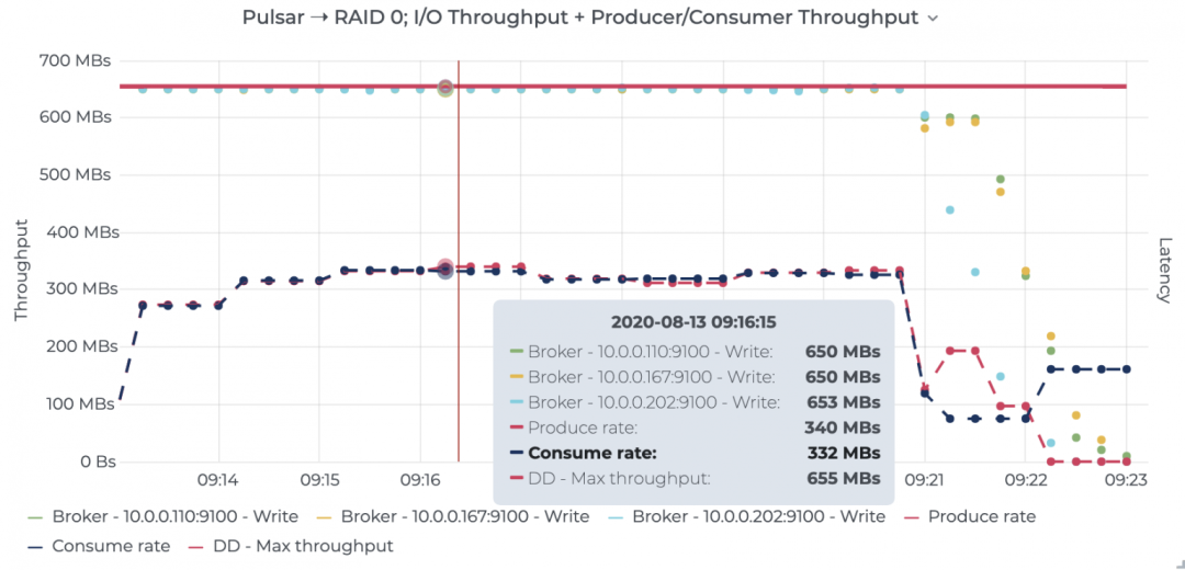 图 10:Prometheus 节点指标显示,RAID 0 磁盘已达到极限,以及最终在 Pulsar 代理上测得的吞吐量。