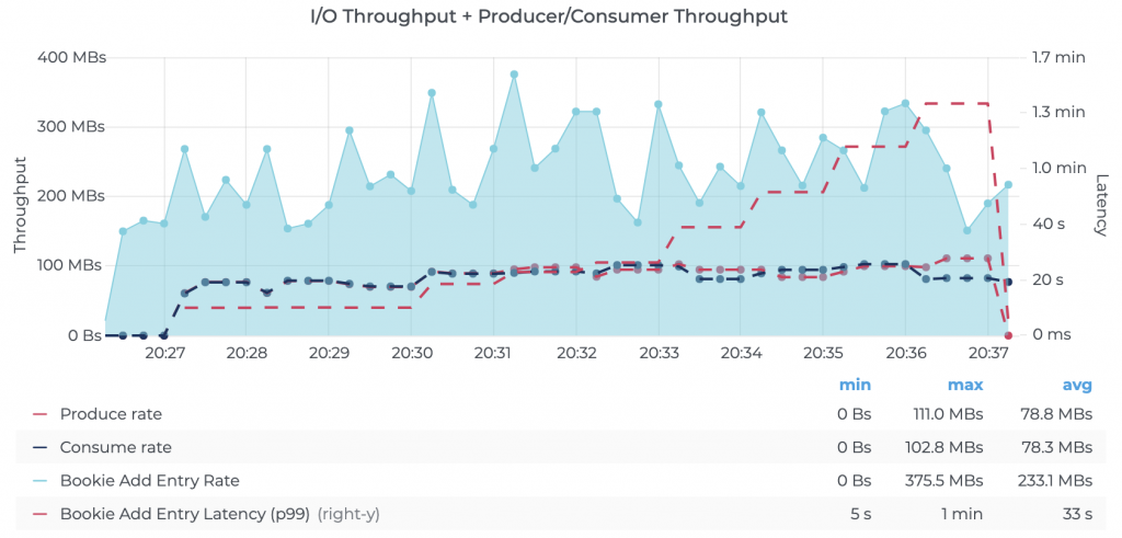 图 8:Prometheus 节点指标显示了 BookKeeper journal 磁盘达到极限和最终在 BookKeeper bookie 上测得的吞吐量。