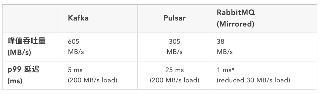 我们发现,Kafka 提供了最好的吞吐量,同时提供了最低的端到端延迟(99.9 百分位)。在吞吐量比较低时,RabbitMQ 传递消息的延迟非常低。