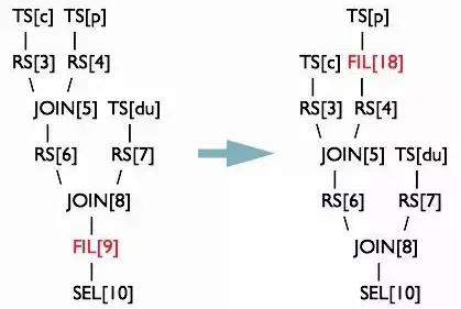 对forum_topic做过滤的where语句写在子查询内部,而不是外部。Hive中有谓词下推优化的配置项hive.optimize.ppd,默认值true,与它对应的逻辑优化器是PredicatePushDown。该优化器就是将OperatorTree中的FilterOperator向上提,见下图。