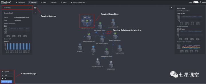 SkyWalking UI提供丰富的功能,包括仪表板展示服务、服务实例和端点的指标,如吞吐量、Apdex分数、响应时间和SLA。用户可自定义仪表板,拓扑结构显示服务间的关系,支持服务选择和自定义组。跟踪查询功能用于查看分布式跟踪,而配置文件则允许方法级别的性能诊断。告警页面展示了触发的告警规则。