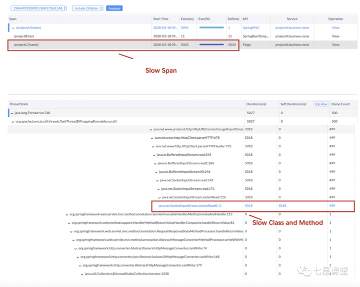 选择正确的跨度后,单击“analysis”按钮,您将看到基于堆栈的分析结果。最慢的方法 已被高亮显示。