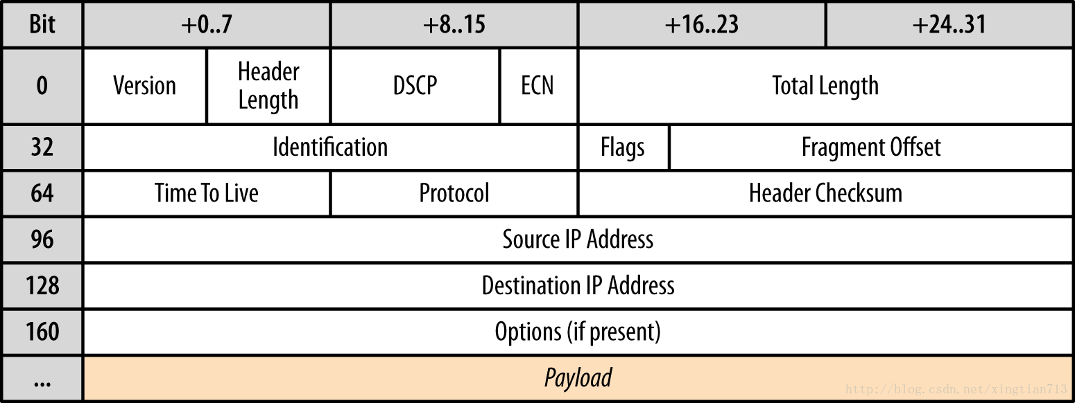 IP层主要任务就是基于地址将数据报从源主机发送到目的主机。要做到这一点,消息都封装在一个IP包( 图3-1 ),标识源和目的地址,以及一些其他路由参数。