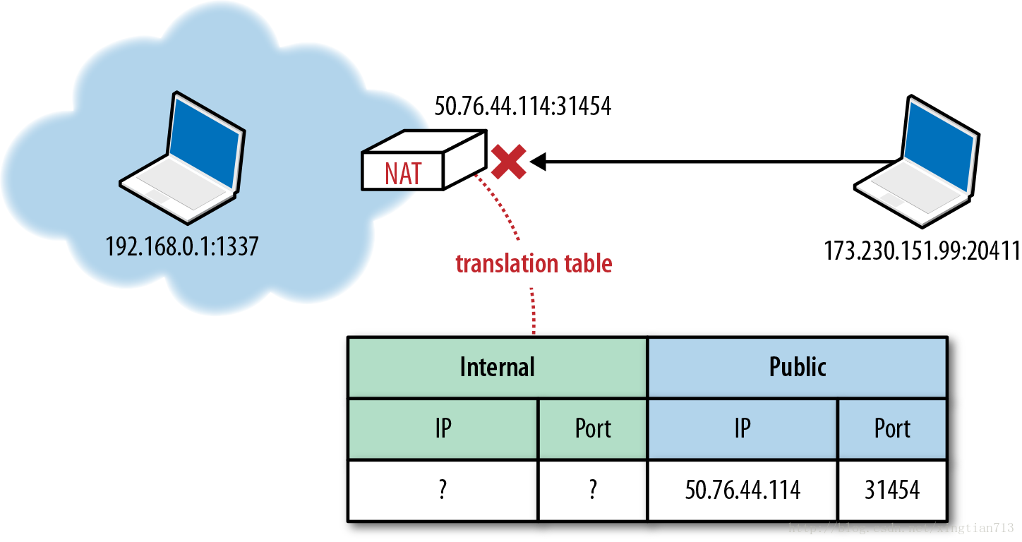 NAT转换的关键问题,至少对UDP而言,是它必须保存数据传输的路由表。NAT依赖网络连接状态,而UDP恰好没有 - 这是一个严重的不匹配,这也为UDP传输问题的根源。此外,现在很普通的一个情况就是NAT内网的设备有很多层,这只会使问题进一步复杂化。