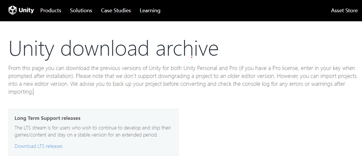 unity3d LTS(2018-2020)国际版本下载与安装。 很多朋友还不太了解LTS是什么版本。我简单介绍一下Long Term Support(LTS),就是长期支持版本。LTS版本是为了正在用老版本开发的项目存在的,项目更换unity版本会造成很多问题。所以尽量不要跨大版本打开项目。这也是为什么LTS存在的理由。在新版本2021出来后,2020的最后一个版本就变为LTS版本。每两周更新一次,直到 2022 年年中,之后更新将每月更新一次,直到 2023 年 3 月(在初始发布日期后两年)。这些更新将仅涵盖旨在提高产品稳定性的可用性修复,使用户能够搬运其项目到
