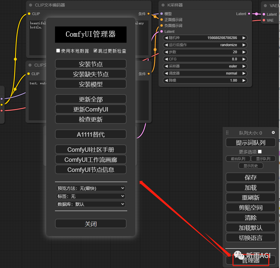 【comfyui教程】ComfyUI 也可以有插件市场 comfyui教程:上文我们介绍了 ComfyUI 的本地部署和基本使用。其中的插件安装,小伙伴们是不是觉得还是有点麻烦的,ComfyUI 有没有类似 WebUI 的插件管理功能呢,其实是有的,而且比 WebUI 的插件管理功能更强大。今天我们就主要来介绍一下这个管理器插件。嗯,顺便再介绍一个中文提示词插件,毕竟这也算是一个刚需插件了。