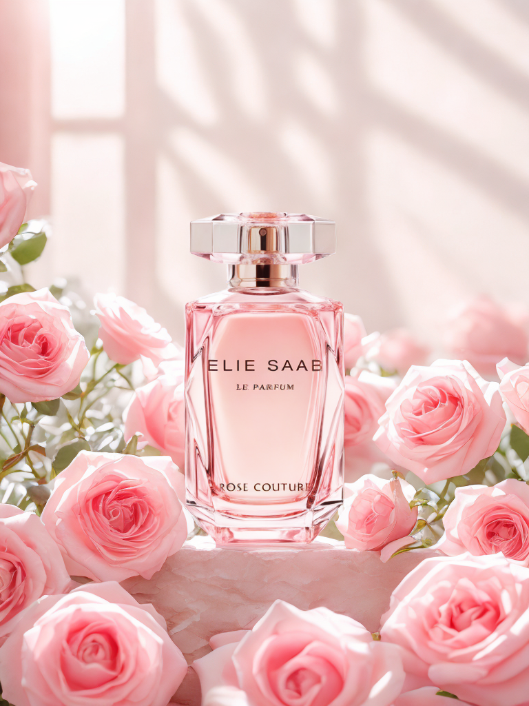 Cosmetics, pink perfume, roses, natural light, surrounded by roses, outdoor, best quality, high quality, high detail, masterpiece, realistic, photographic composition, epic light source