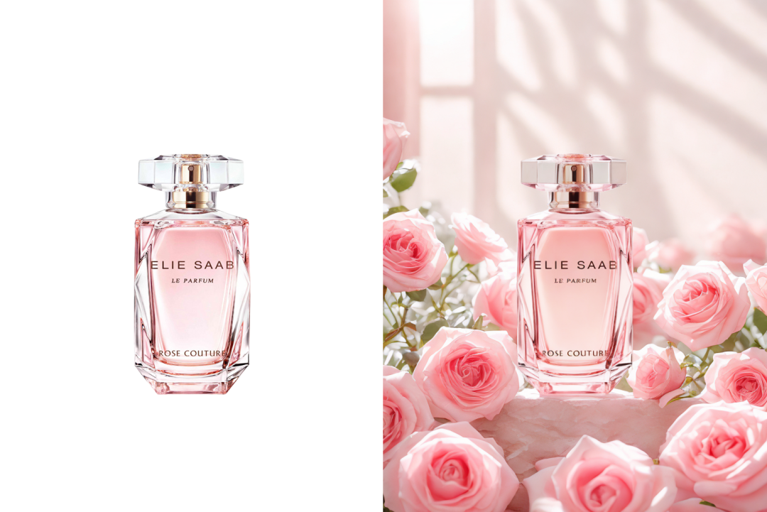 化妆品,粉色香水,玫瑰花,自然光,被玫瑰花包围,户外,最佳质量,高质量,高细节,杰作,真实感,摄影构图,史诗级光源