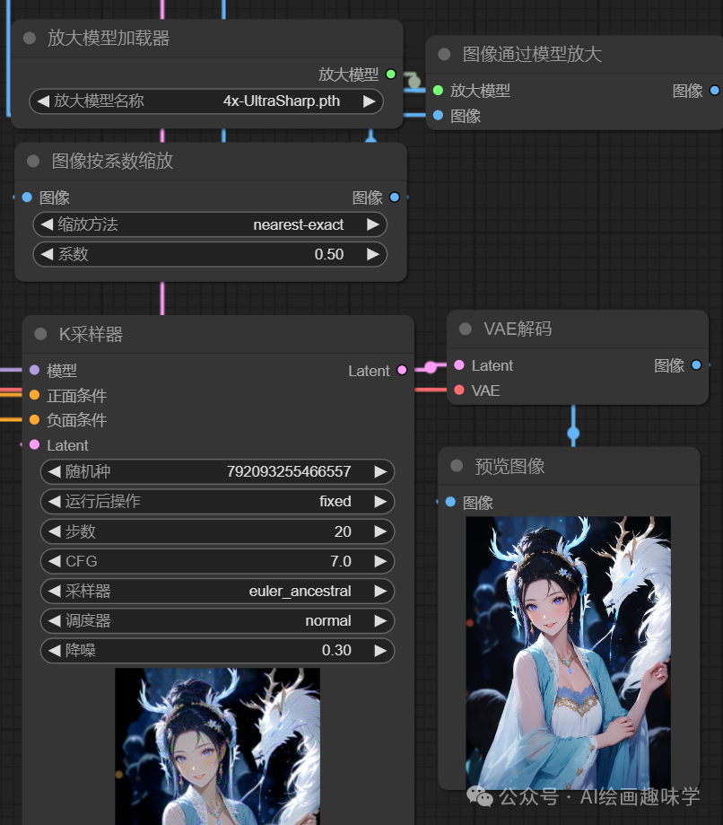 第四步:模型放大后再进行二次采样,这个符合我们平时高清步骤,这样做是为了效果更精细一些,我这里先放大四倍,再缩放成2倍的。