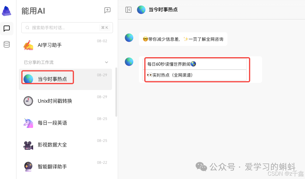 2. 整合工作流程:你在市面上会碰到各种各样的AI工具,你可以将不同的AI工具整合到你的工作流程中,在形成一个高效的工作流。 例如:(1)使用能用AI里面的工作流,进行项目管理。(2)同时在利用AI助手来处理日常的文档和数据分析,这样可以大幅度提高工作效率。