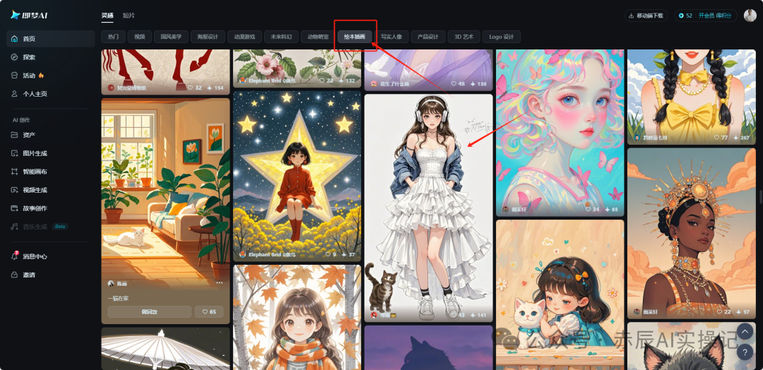 第一步,打开即梦官网后,我们点击绘本插画风格的公共区域,去查找自己满意的风格图片。例如我找到一张我觉得画面效果还不错的图片,点击图片。