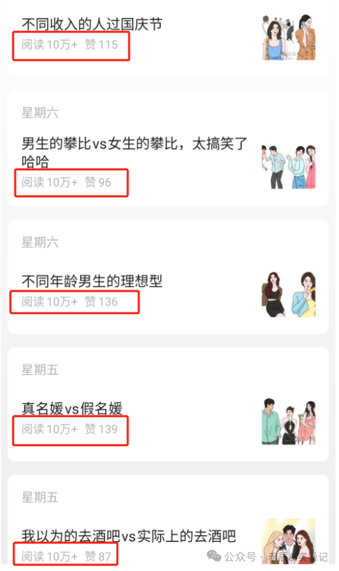 像下图这个账号,画面风格统一,各种爆笑沙雕日常选题,近半个月时间内,就有11篇图文内容阅读量超10万+。