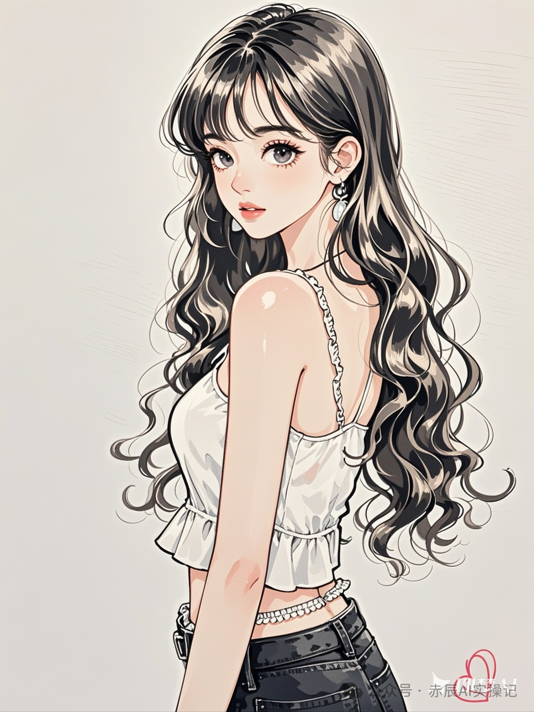女孩手绘插画,速写,长卷发, 时尚穿搭,吊带衣,腰细,半身照,侧身回眸,可爱卡通,肖像,浪漫温馨,复古,纯白背景