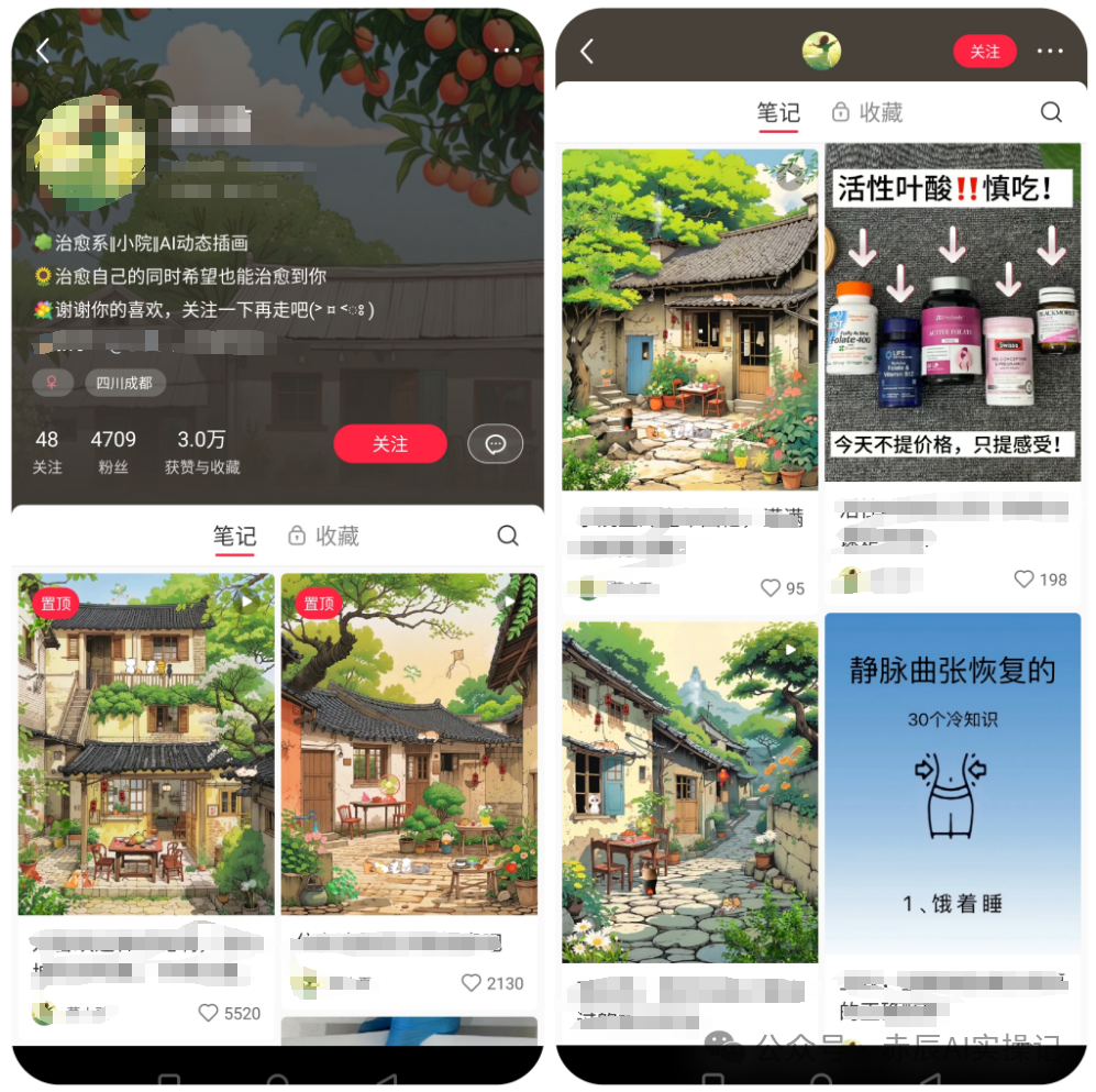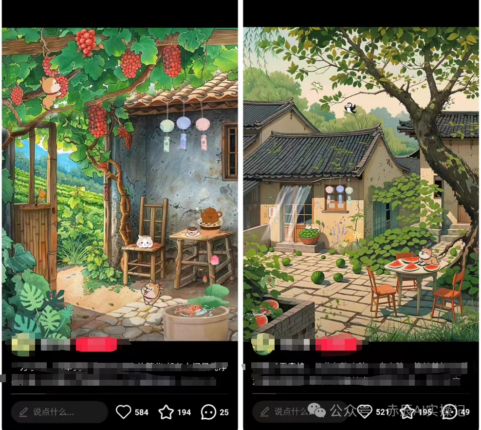 而且这类视频制作非常简单,直接用AI批量生成小院图片,然后配上剪映的动态贴纸图片,新手10分钟就可以制作完成一条视频。咱先简单分析一下,这类账号为什么能在小红书上爆火,文章后半部分会详细教大家如何用AI制作。