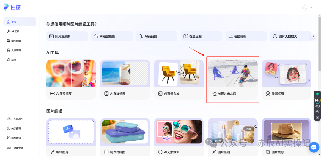 免费的去水印工具,可以选择佐糖,进入链接官网后,点击“AI图片去水印”功能。
