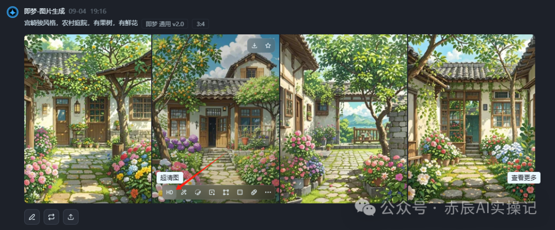 在生成好的四张图片张,选择其中一张图片,点击“HD超高清”功能。