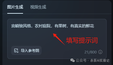 接着在输入框中输入提示词,例如:宫崎骏风格,农村庭院,有果树,有真实的鲜花。