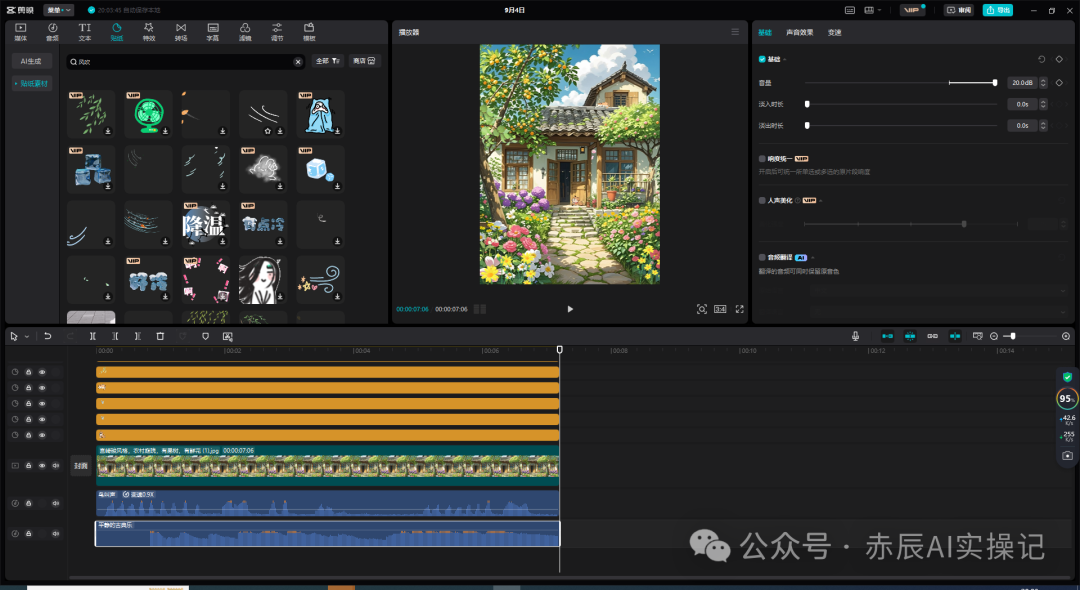 这一步非常简单,打开剪映,只需将AI生成好的图片导入进剪映后,设置视频时长为7秒,接着添加动态贴纸,例如蝴蝶,树枝,鲜花,小动物,最后添加音效,例如鸟鸣声,小狗叫声,背景音乐添加舒缓的轻音乐即可。