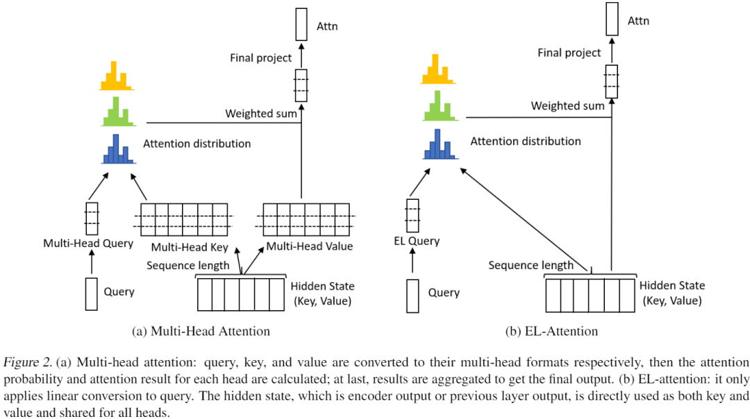 3)在显卡中,如果两个三维矩阵运算时,他们的第一维大小相同,则运算通过并行运算其中的各个二维矩阵运算完成。推断过程中,Q只是下一个词的隐状态,而K,V则显存占用比Q大得多,描述整个上文/输入信息。Q对K和V的运算,反复加载大量显存占用的K和V,增大IO吞吐量负担。(EL-Attention后面则减小query的第一维,增大query第二维,从而通过一次矩阵运算得到完整的各个头的计算结果,避免了反复加载key的值)