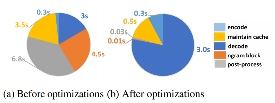 首先我们知道,训练和推断的时候,编码器端的运行是相同的,所以变慢的原因都在解码器端。即使我们设置beam search增加了一些计算量,但是实际上我们等待的时间远远大于理论上增加的计算量,把常见的生成任务的测试集完整的生成一遍结果,动辄几个小时的等待时间,到底花在哪里了呢?通过每个调用函数的时间消耗分析,作者得出了结论是:推断的代码中,把完整的矩阵运算打散成了每次只能预测后续一个词,零散的运算(从训练时 teacher forcing 的完整矩阵的Q,K,V计算,变成了推断时每次Q都只有一个词,去和K,V自回归地计算若干遍)从而显存的带宽成为了推断速度的瓶颈。