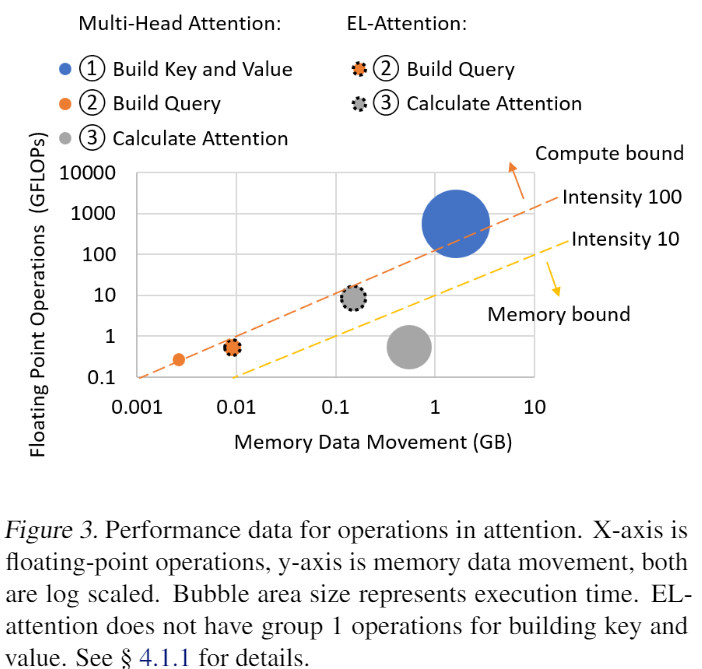 为了比较上述三个步骤,用计算换取减少显存的操作是否收益大于付出,EL-Attention使用下面的图来表示这种权衡的收益。下图中,横轴是显存的使用量,纵轴是计算量,面积代表时间消耗。传统做法的时间消耗由三部分组成,图中为无边框的蓝色的大圈,灰色的大圈和橙色的小圈。EL-Attention的时间消耗由两部分组成,虚线边框的灰色小圈和橙色圈,可以看到,由于重新平衡了指令密度,显存消耗和计算消耗,总时间消耗(两个虚线边框圆的总面积)明显小于传统做法(三个无边框圆的总面积)。