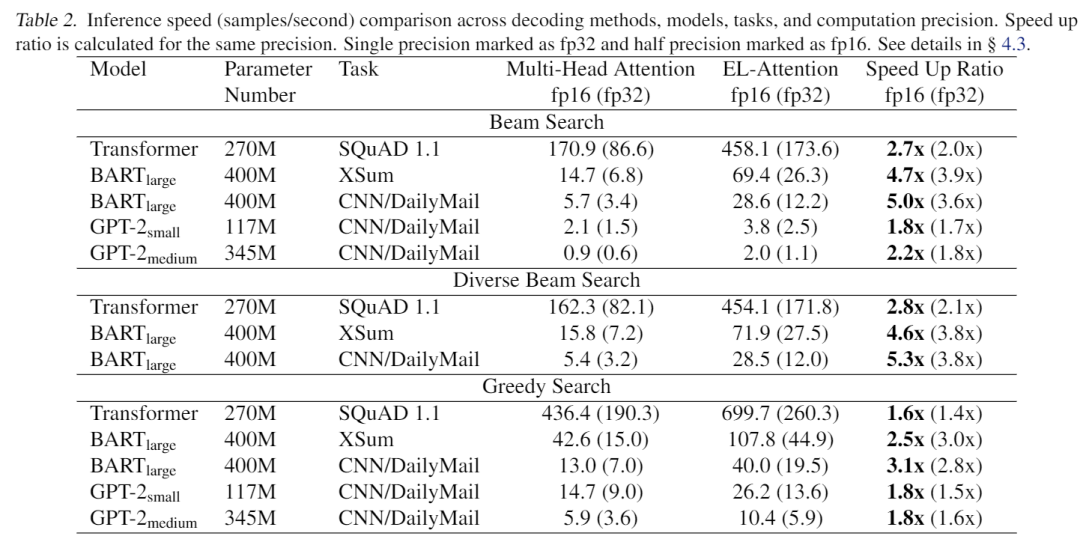 此外,EL-Attention在真实模型和数据集上开展试验。它使用Transformer,BART,GPT-2作为实验模型,其中Transformer和BART为编码器-解码器结构,GPT-2为只有解码器的结构,在SQuAD 1.1问题生成、XSum摘要任务、CNN/DM摘要任务上开展试验。beam size越大,EL-Attention的加速效果越明显,EL-Attention作者很保守的把所有模型的beam size都开的比较小,只有4,就有了若干倍的速度提升。