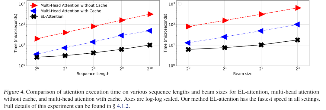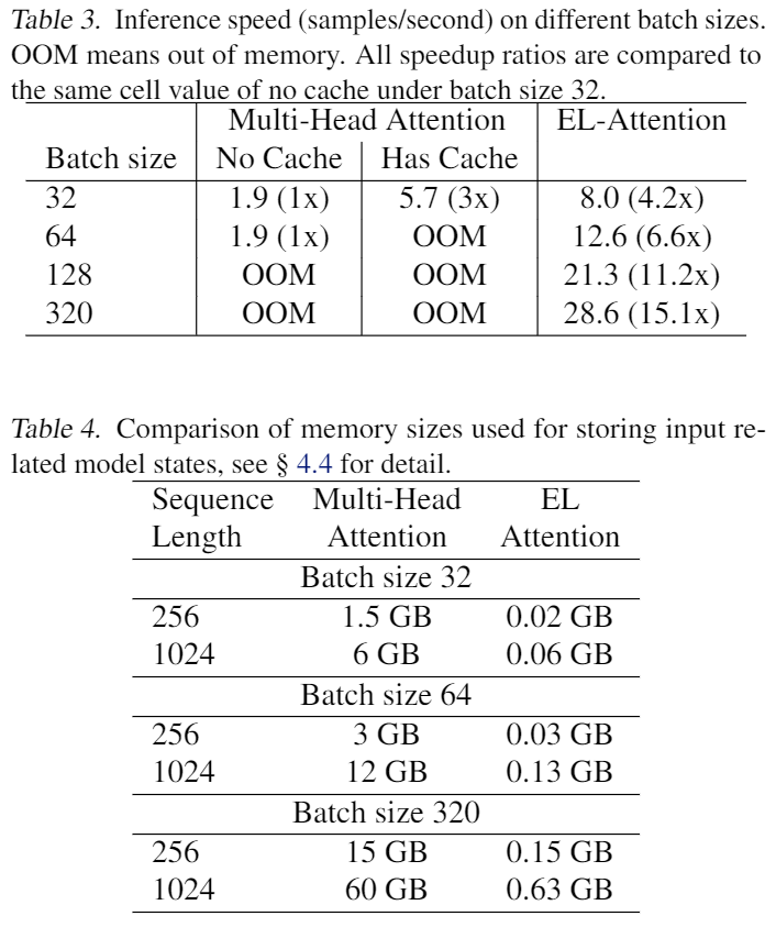 很明显的我们看到,原始计算里使用的是经过线性变换后的多头 进行计算,而EL-Attention中,则直接使用输入的 进行计算。这就是本文的核心做法,只cache隐状态H而非多个低维度的多头 ,从而进行更高效的矩阵运算,显著减少显存占用。