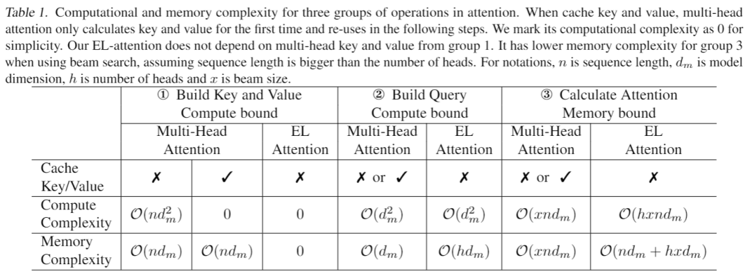 首先看Build Key and Value,传统的做法中,如果不cache,则需要每次进行 的计算,然后把计算结果存起来(存储复杂度 )。他的计算复杂度高,需要反复重新计算,cache则相反。而EL-Attention中,由于直接使用原始的输入K,V进行计算,无需计算出多头的那些 ,因此计算和显存都为0。