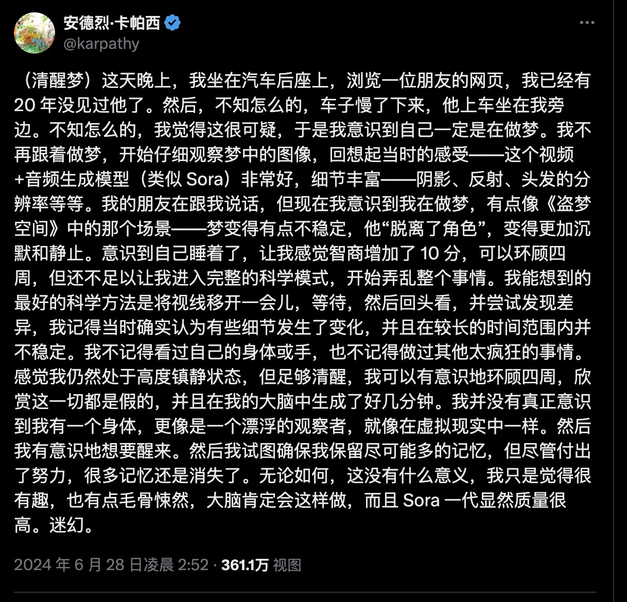 Karpathy在帖子中提到,他感觉梦境像一个Sora模型,充满了丰富的细节,而且自己的智商突然提高了10点。