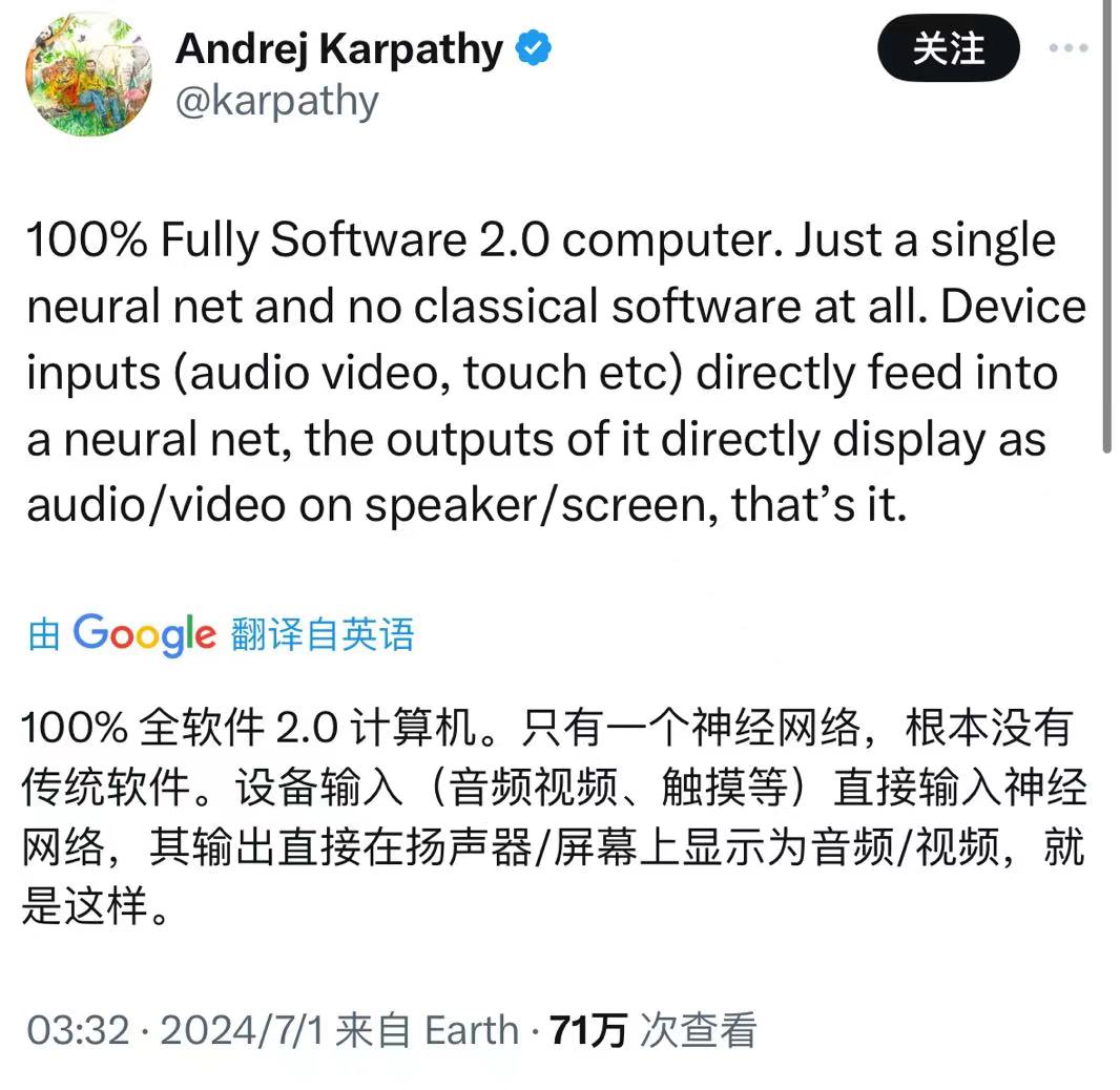 昨天凌晨,知名人工智能专家、OpenAI的联合创始人Andrej Karpathy提出了一个革命性的未来计算机的构想:完全由神经网络驱动的计算机,不再依赖传统的软件代码。