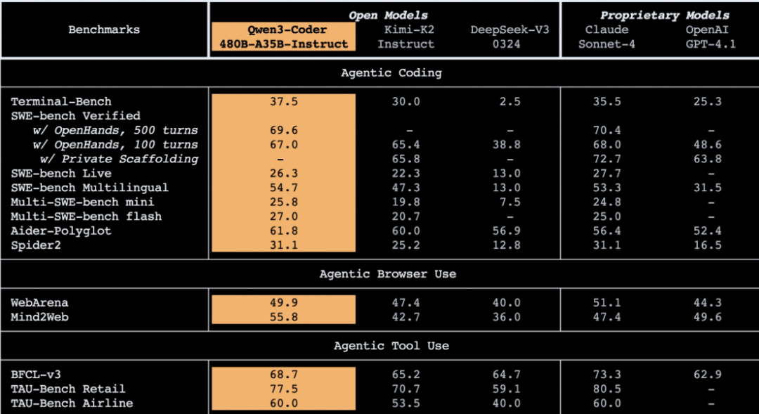 Qwen3-Coder 的核心能力与训练范式也有新的突破,比如:
