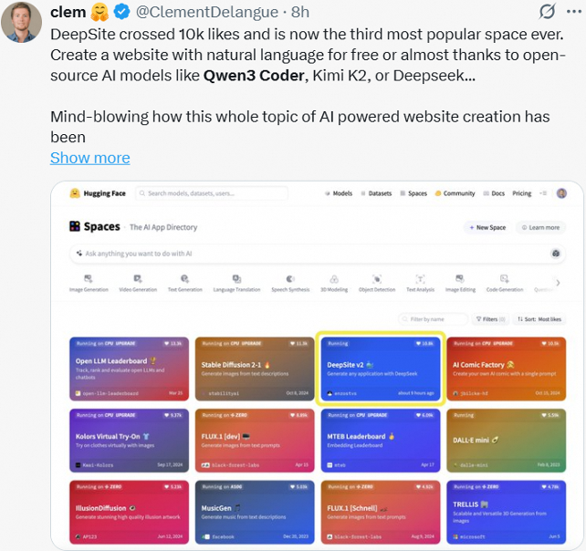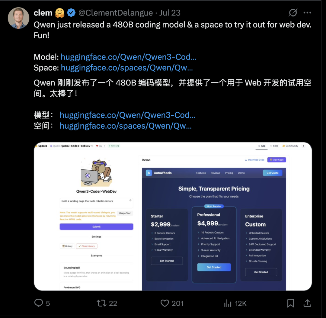 Huggingface CEO clem 不仅点赞了 Qwen3-Coder 新模型,而且刷屏瀑布流地夸 Qwen3-Coder。