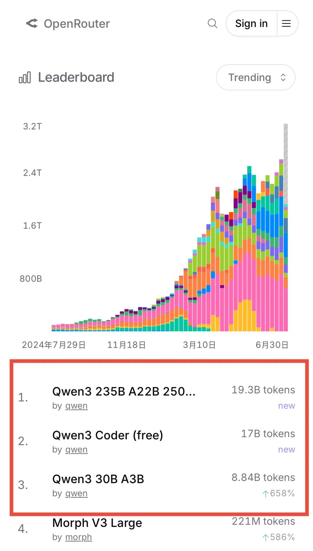 OpenRouter 数据显示,阿里千问的 API 调用量暴涨,过去几天已经超过了 1000 亿 tokens,包揽最热门调用模型的前三。