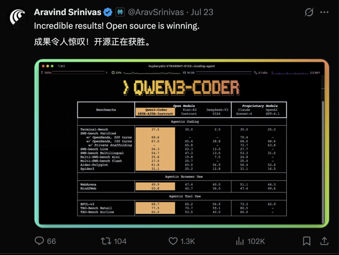 还有 PerplexityCEO Aravind Srinivas 也认可 Qwen3-coder 实力。