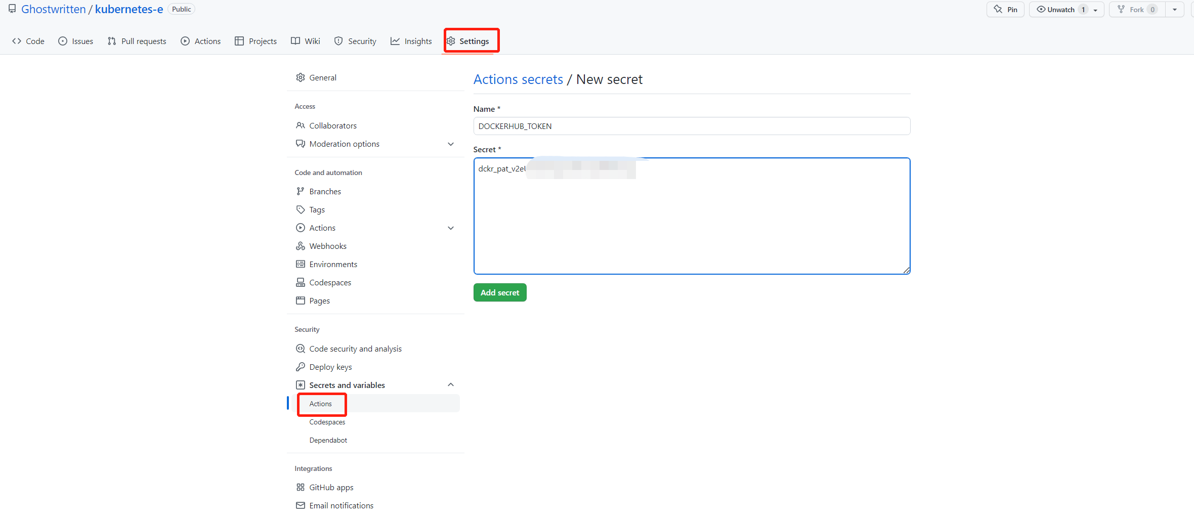 在 Secret 输入框中输入刚才我们复制的 Docker Hub Token,点击“Add secret”创建。