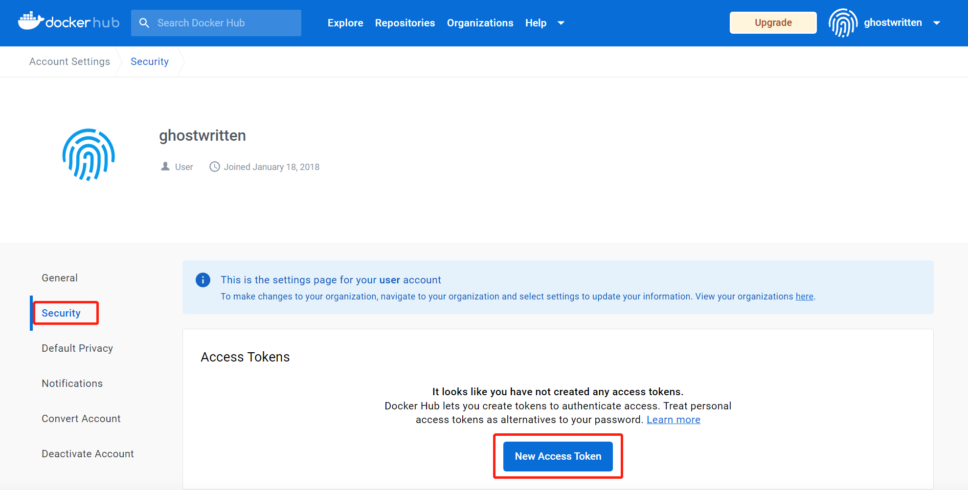 创建完 build.yaml 文件后,接下来,我们需要创建 Docker Hub Secret,它将会为工作流提供推送镜像的权限。首先,使用你注册的账号密码登录 https://hub.docker.com/。然后,点击右上角的“用户名”,选择“Account Settings”,并进入左侧的“Security”菜单。