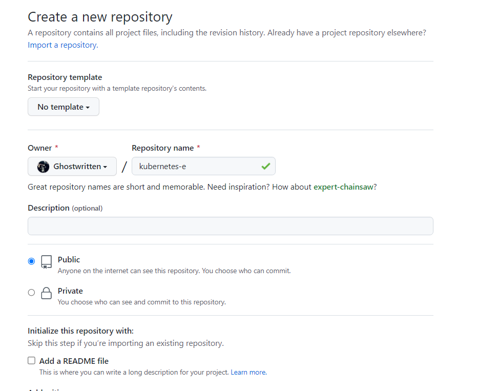 创建完 build.yaml 文件后,接下来,我们要把示例应用推送到 GitHub 上。首先,你需要通过这个页面来为自己创建新的代码仓库,仓库名设置为 kubernetes-example。