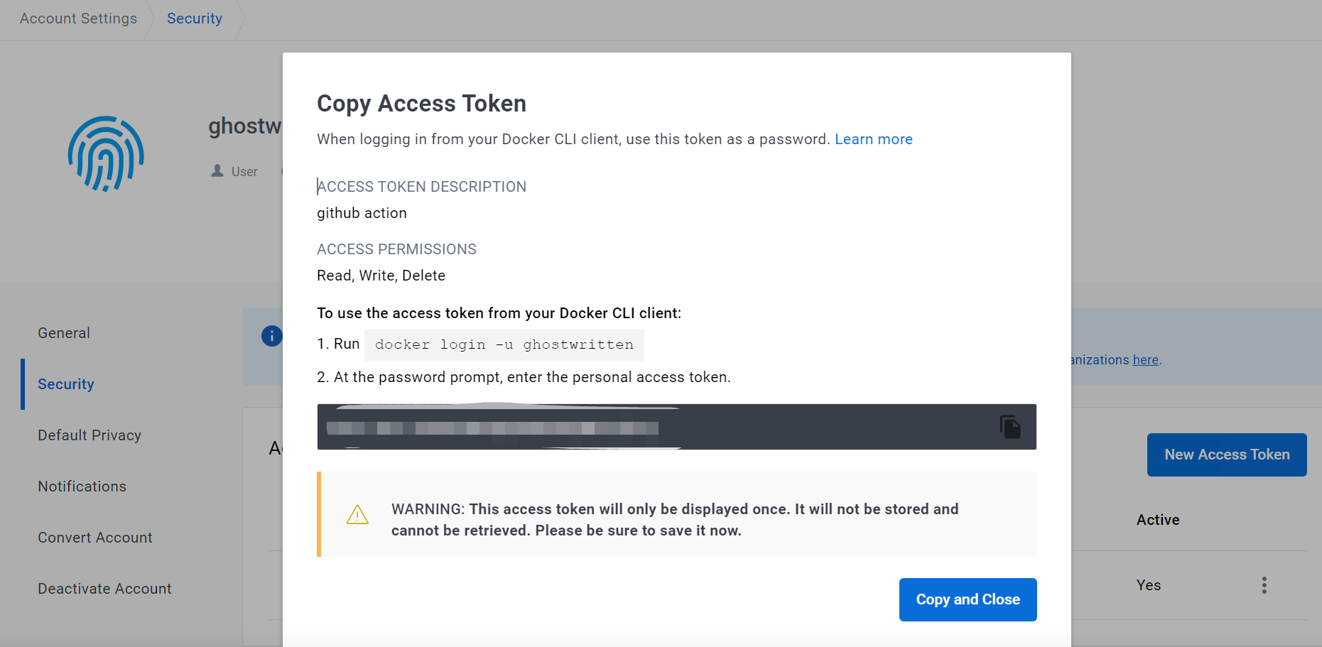 点击“Copy and Close”将 Token 复制到剪贴板。请注意,当窗口关闭后,Token 无法再次查看,所以请在其他地方先保存刚才生成的 Token。