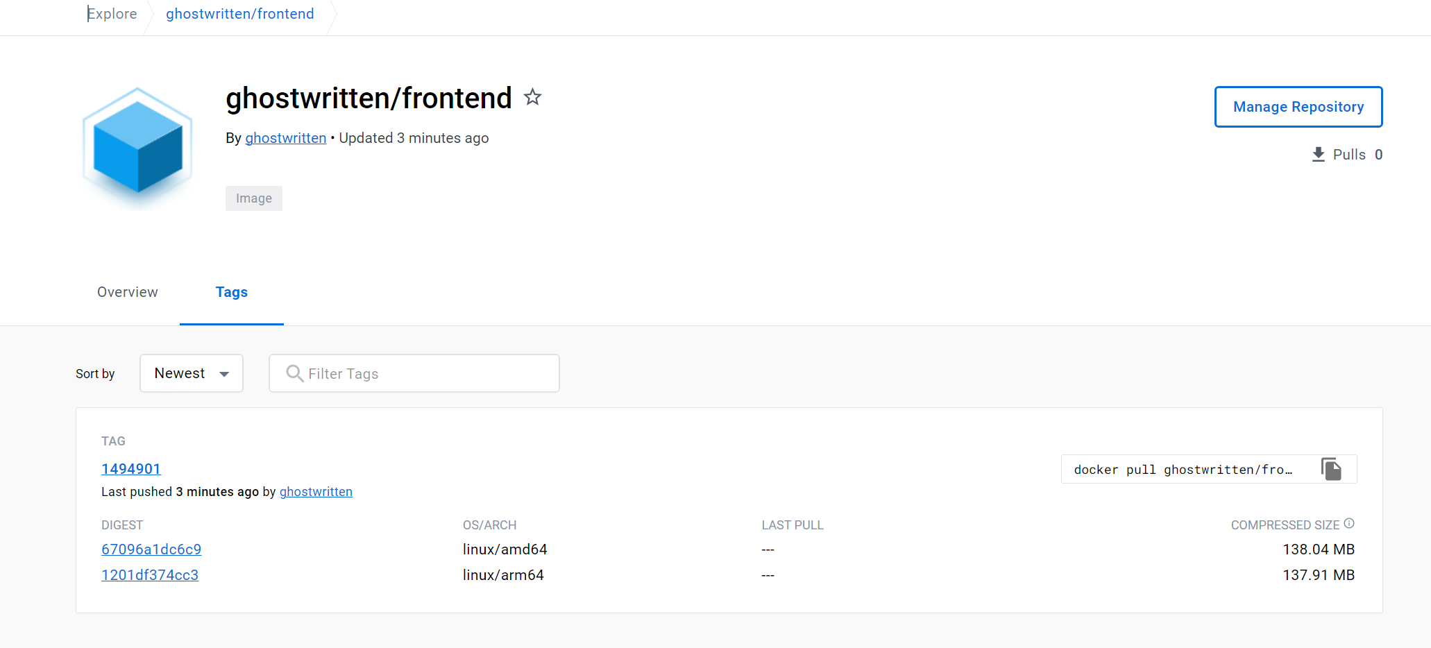 当工作流运行完成后,进入到 Docker Hub frontend 或者 backend 镜像的详情页,你将看到刚才 GitHub Action 自动构建并推送的新版本镜像。