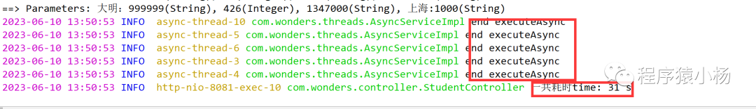 //1、自定义asyncServiceExecutor线程池@Override@Async("asyncServiceExecutor")public void executeAsync(List<Student> students,StudentService studentService,CountDownLatch countDownLatch) {try{log.info("start executeAsync");//异步线程要做的事情studentService.saveBatch(students);log.info("end executeAsync");}finally {countDownLatch.countDown();// 很关键, 无论上面程序是否异常必须执行countDown,否则await无法释放}}