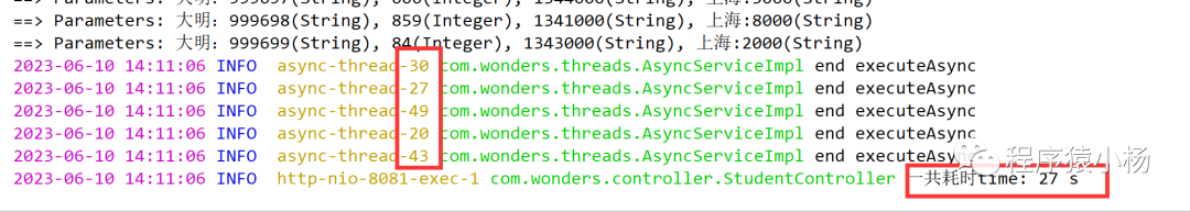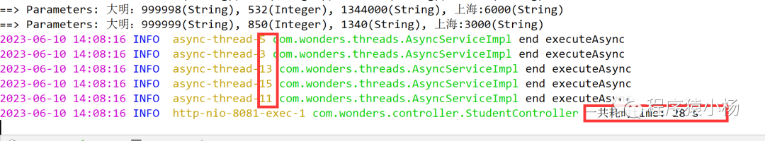 public int batchInsertWay() throws Exception {log.info("开始批量操作.........");Random rand = new Random();List<Student> list = new ArrayList<>();//造100万条数据for (int i = 0; i < 1000003; i++) {Student student=new Student();student.setStudentName("大明:"+i);student.setAddr("上海:"+rand.nextInt(9) * 1000);student.setAge(rand.nextInt(1000));student.setPhone("134"+rand.nextInt(9) * 1000);list.add(student);}//2、开始多线程异步批量导入long startTime = System.currentTimeMillis(); // 开始时间//boolean a=studentService.batchInsert(list);List<List<Student>> list1=SplitListUtils.pagingList(list,100); //拆分集合CountDownLatch countDownLatch = new CountDownLatch(list1.size());for (List<Student> list2 : list1) {asyncService.executeAsync(list2,studentService,countDownLatch);}try {countDownLatch.await(); //保证之前的所有的线程都执行完成,才会走下面的;long endTime = System.currentTimeMillis(); //结束时间log.info("一共耗时time: " + (endTime - startTime) / 1000 + " s");// 这样就可以在下面拿到所有线程执行完的集合结果} catch (Exception e) {log.error("阻塞异常:"+e.getMessage());}return list.size();}