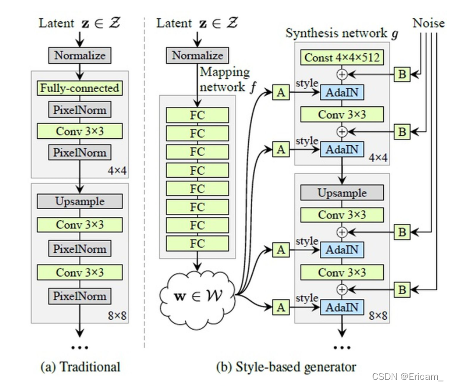 初始的随机噪声z需要先经过一层PixelNorm,对应图中的Normalize。