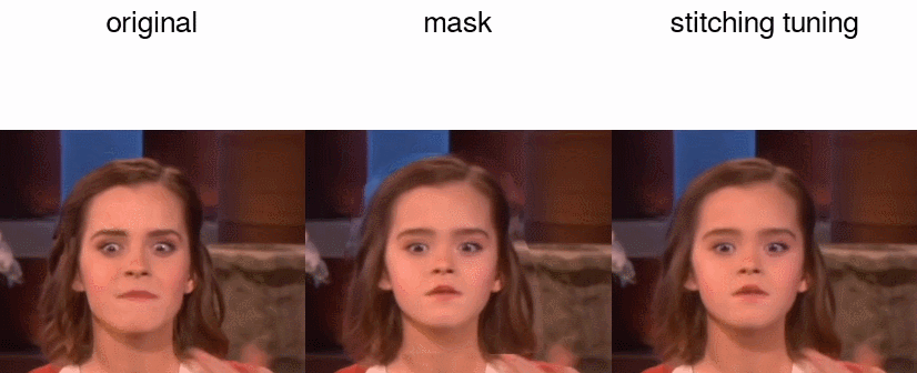 作为最后一步,我们必须将编辑过的人脸贴回原始视频。如果只是直接覆盖裁剪面部的原始位置,这种效果是不好的,因为编辑过程通常会导致背景发生变化。以前的工作选择通过使用segmentation mask来限制面部区域的修改,然而这种融合仍然容易导致边界周围不一致。受PTI的启发,我们提出了一种新颖的方案来解决该问题:Stitching Tuning。