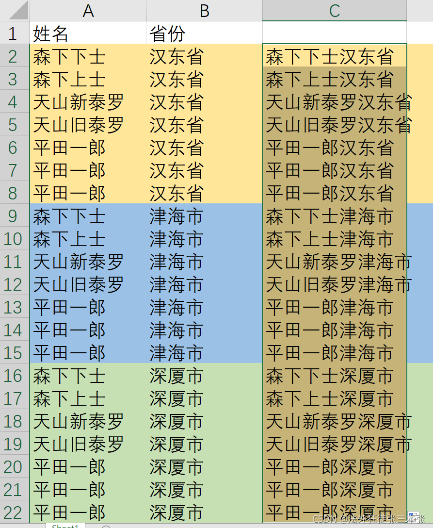 在使用Excel处理数据时,我们通常会遇到这样的问题:如图所示,三个省份都有一帮潜逃的罪犯,但是就这么巧,每个省份的罪犯都叫那几个名字。因为每个省的名单里面都有重复的人名,如果我想去除同一省份的相同人名,直接使用删除重复值,显然是不行的,因为汉东省的平田一郎和津海市的平田一郎不是一个人。解决方案:在C列将A\B两列拼接起来,函数为=CONCAT(A2,B2),然后黑色十字下拉,这样在第三列删除重复值就一定不会误删了。这就是同时利用两列去除重复值的方法。...