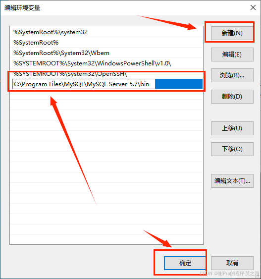 4.把安装的MySQL Server 5.7\bin的路径粘贴上去,再上移至最上面,再连续点击3个点确定回到桌面即可,环境变量初步设置完成。