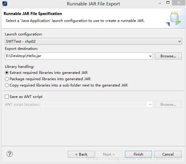 (2)在Lanch configuration选择启动的主程序main 在Export destination选择你要保存的目录和名字,然后finish
