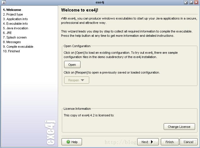 (2)打开exe4j,跳过欢迎,直接点击左侧导航的第二项,因为我们已经提前将java项目打包成可执行jar文件了